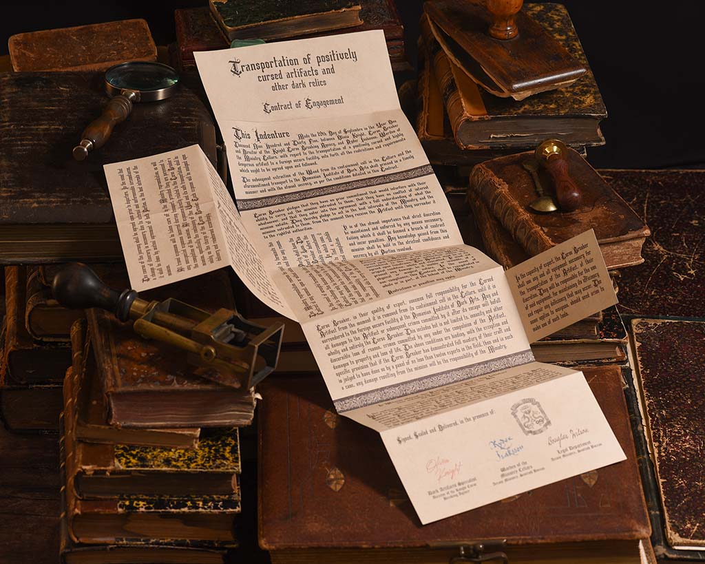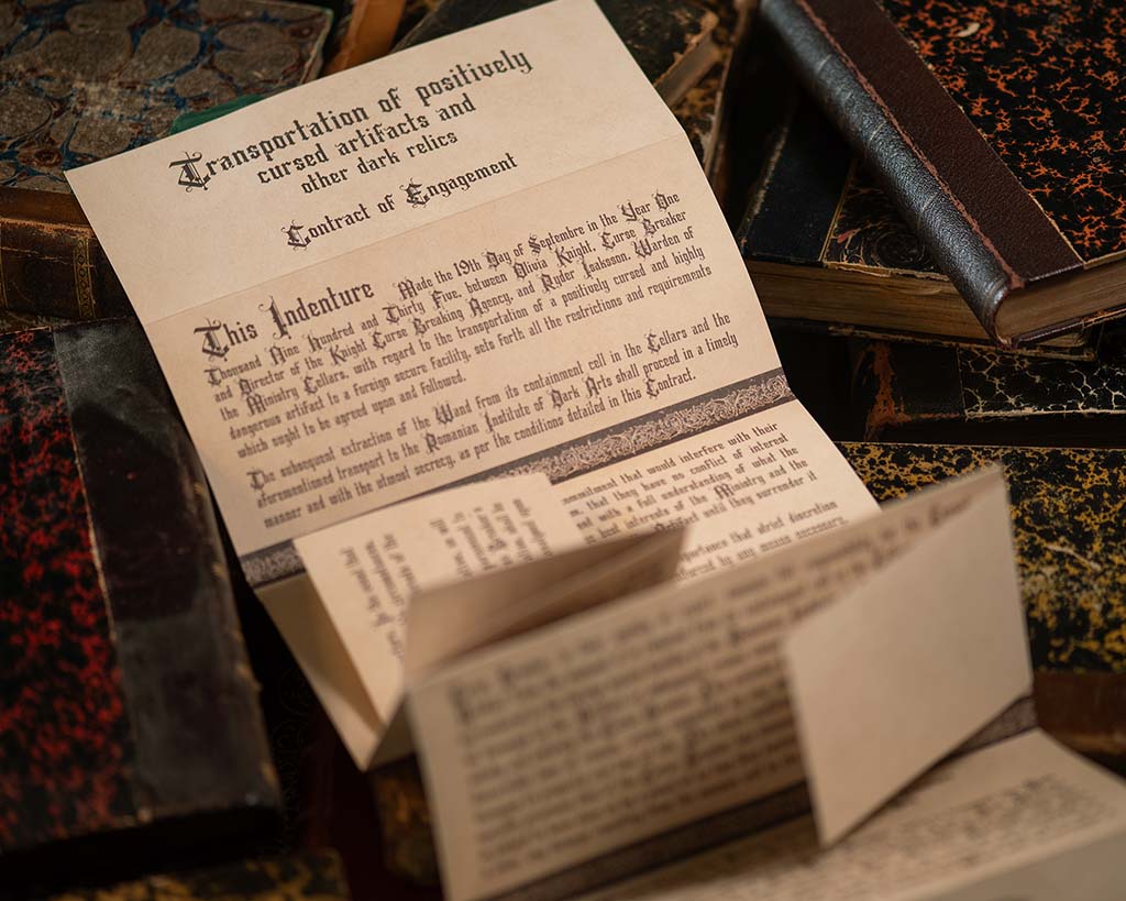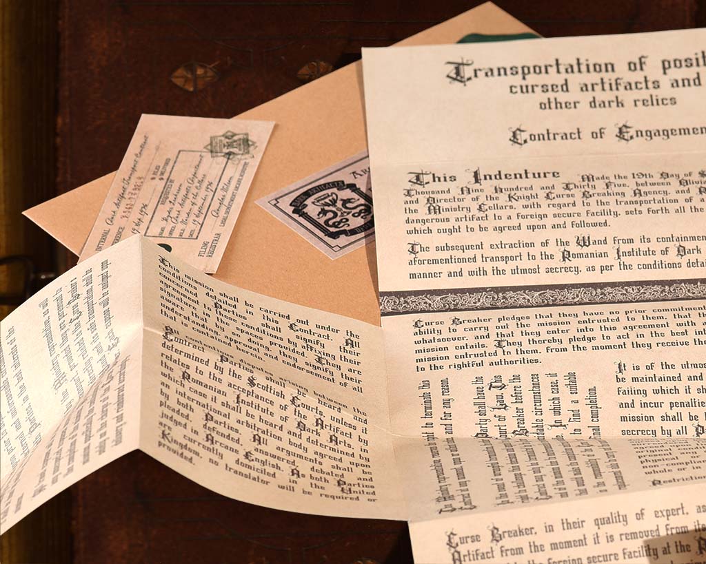 Every curse-breaker knows the importance of a proper transport contract—but few are as elaborate (or as exhausting) as this one. This replica reproduces the official document signed by Olivia Knight and Warden Isaksson to authorize the transport of the infamous Dark Wand to Romania under Arcane Ministry supervision.